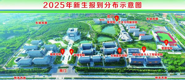 (2)直接到各学院报到点的新生家长车辆可根据具体报到点位置(详见下方报到地点示意图)选择从学校北门或南门进入校园。