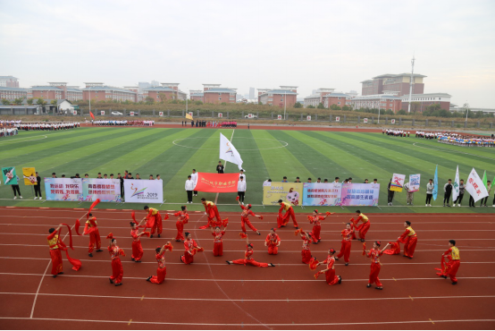 开幕式上,近千名学生参加了文艺表演,场面恢宏壮观、震撼人心、寓意美好。啦啦操表演《哈哈颂》,将舞蹈、音乐与技巧融为一体,260名同学不断奔跑、变换队形,充分展示出当代大学生的青春与活力。花鼓健身操表演,把传统凤阳花鼓与现代健身操相结合,被誉为“东方芭蕾”的凤阳花鼓,被赋予新时代全新的视听体验和丰富内涵。由384名同学带来的大型团体操《中华腾飞》,展现了同学们勤学奋进的精神风貌和对未来充满希望,为中华腾飞团结奋斗的凌云壮志。武术表演《中国少年》彰显了华夏几千年的文明传承,展现了中华儿女卓越的飒爽英姿。