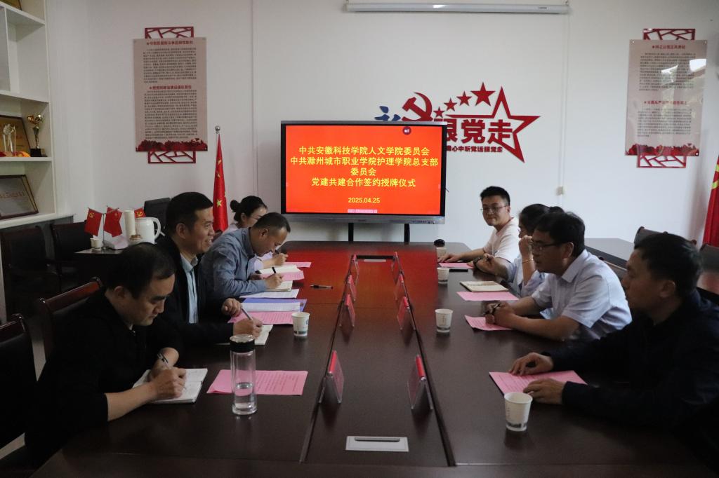 4月25日下午,中共安徽科技学院人文学院委员会与护理学院总支部委员会在护理学院党员活动室举行党建共建合作签约授牌仪式。双方学院领导班子成员、党支部代表等共8人出席活动,仪式由护理学院副院长李勋华主持。