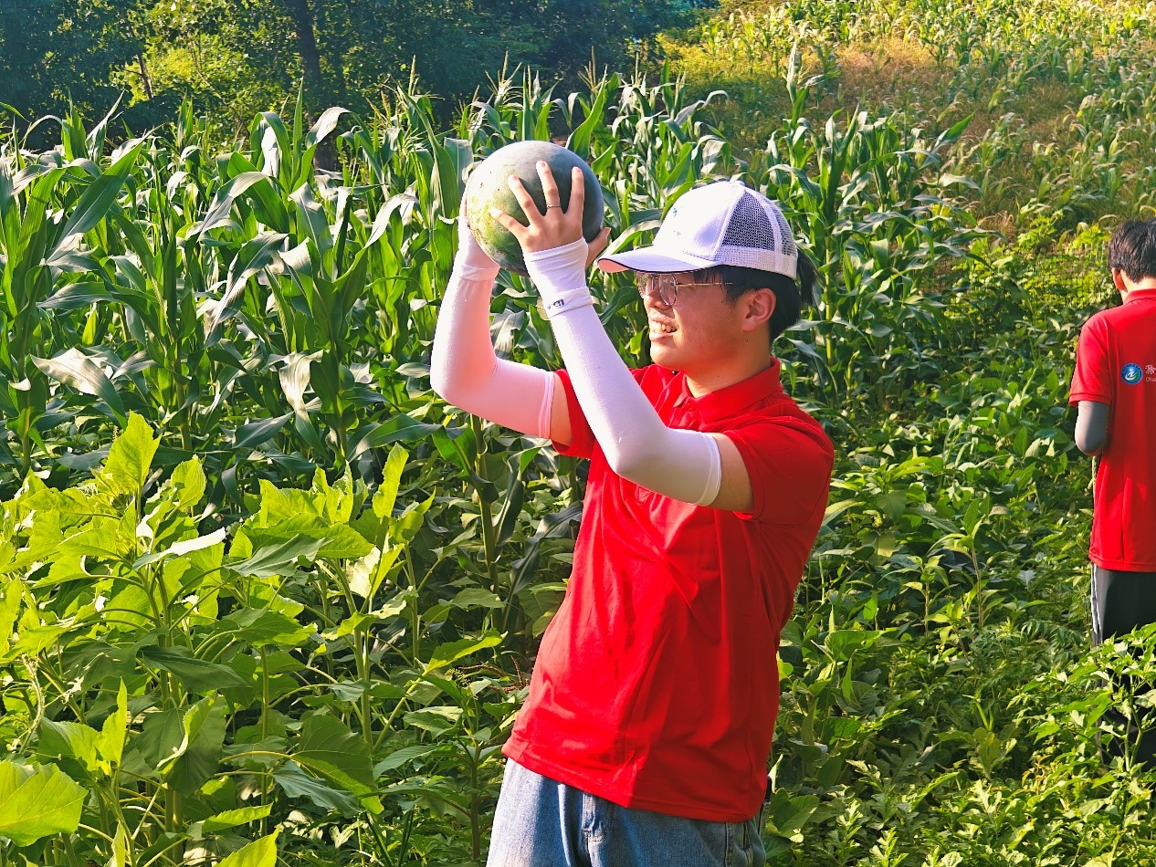 7月2日下午,实践小分队在大牛文化传媒公司杨阳的带领下,走进龙山生态种植园。夏日的田间生机勃勃,杨阳详细介绍了种植园的特色作物:鲜红透亮的小西红柿挂满枝头,长势喜人的黄瓜缀满藤蔓,饱满多汁的西瓜正迎丰收。队员们兴致勃勃地走进瓜田,挽起衣袖参与西瓜采摘,在亲手摘下一个个沉甸甸的果实中,体会劳动的艰辛与收获的喜悦,更直观地了解了农产品从种植到收获的全流程,加深了对“乡村振兴,产业先行”的理解。