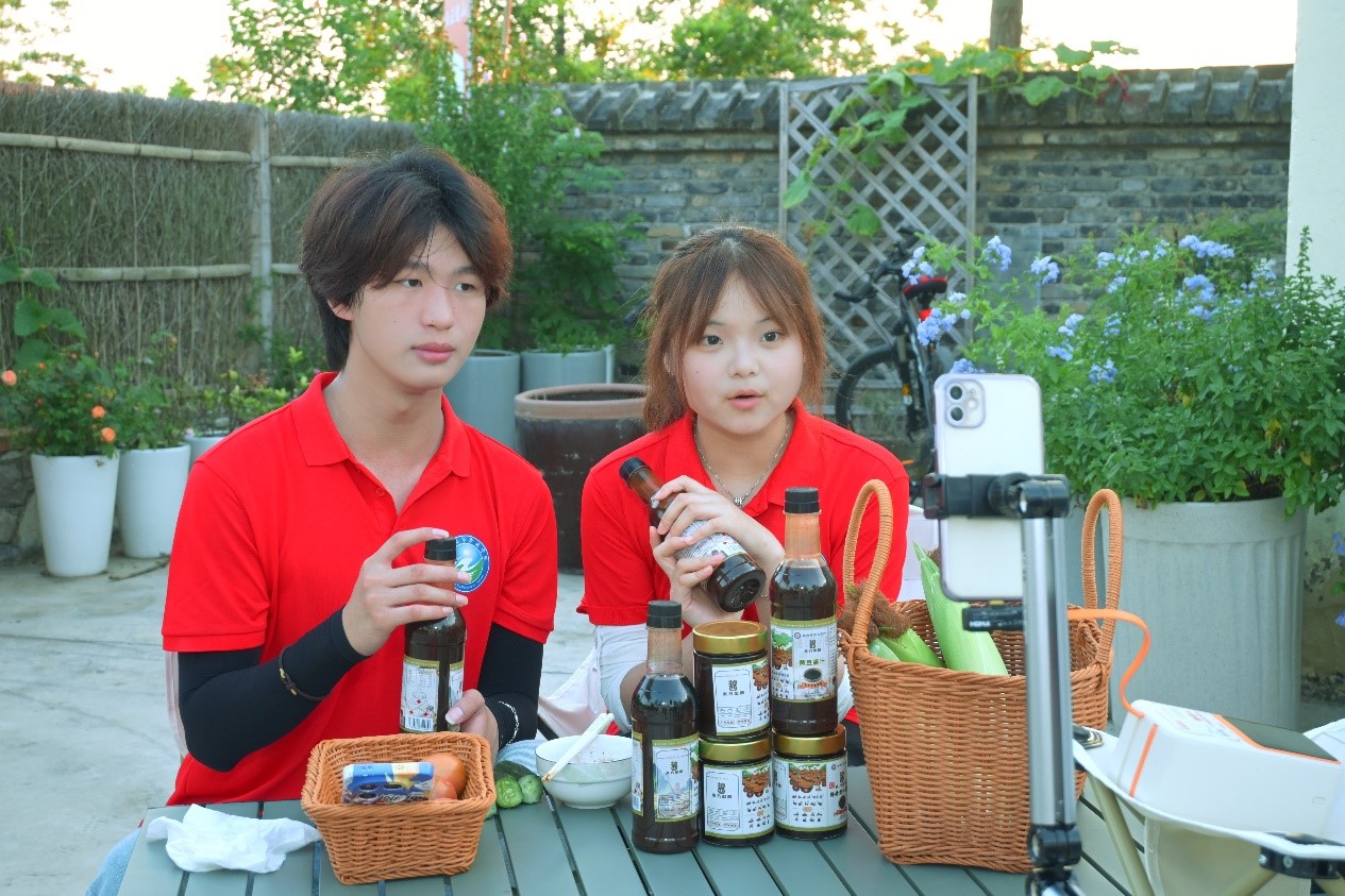 7月3日下午,实践小分队与大牛文化传媒有限公司携手,在西王镇龙山村电商示范基地开展直播助农活动。镜头前,队员们化身“带货主播”,热情介绍当地非遗酱汁的独特风味,用生动的讲解和真诚的互动吸引了众多网友关注。直播间气氛热烈,订单不断,最终成功卖出十余单全椒非遗产品,让非遗文化在电商平台绽放新活力。
