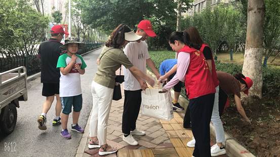党员志愿者们身着志愿者服装或绶带,佩戴党员党徽“亮身份”,手持清洁工具,沿着小区道路两旁的绿化带,捡拾烟头、垃圾,清除绿化带中杂草杂物;引导居民共同美化家园、共同守护家园,自觉养成健康卫生的文明生活方式。