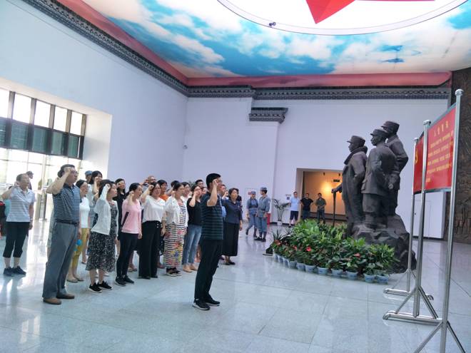 随后,前往新四军史料陈列馆,在馆中,全体党员面对鲜红的党旗重温了入党誓词。在讲解员的解说和引导下,仔细观看了馆中陈列的图片和实物资料。党员同志们在珍贵的文物前驻足停留,重温了那段惊心动魄的历史和血水交融的峥嵘岁月,深深为新四军将士百折不挠、抗争到底的革命精神和将生死置之度外的英雄气概所感动。