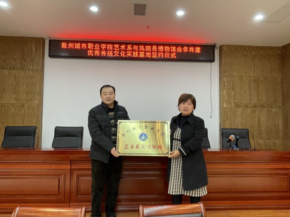 为充分发挥优秀传统文化在学院人才培养和服务地方经济文化发展中的重要作用,艺术系与凤阳县博物馆、凤阳凤画研究会、凤阳县中都西苑幼儿园三家单位合作,成立艺术系实践实习基地。11月26日,艺术系副主任喻家江与美术教育专业负责人刘晓玲在凤阳县博物馆与三家单位举行了基地签约和授牌仪式。