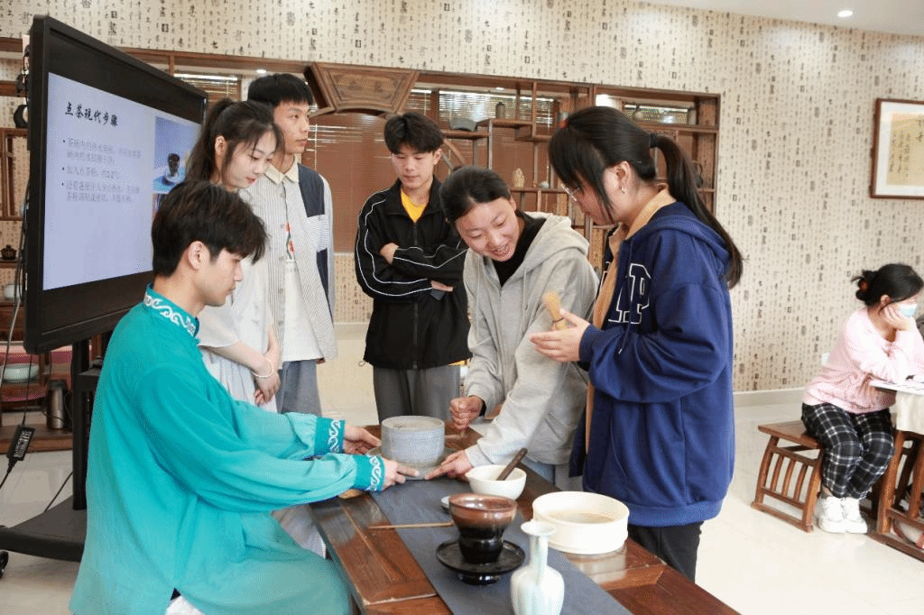 在如行云流水一般的音乐中,来自管理与信息学院的闻清健同学,身着飘逸的传统服饰为同学们表演了仿宋点茶,宋朝茶文化在这里实现了“时空穿越”。活动吸引了众多同学参与其中,在老师的指导下,很多同学第一次亲自体验点茶,再次感受到传统文化的魅力。