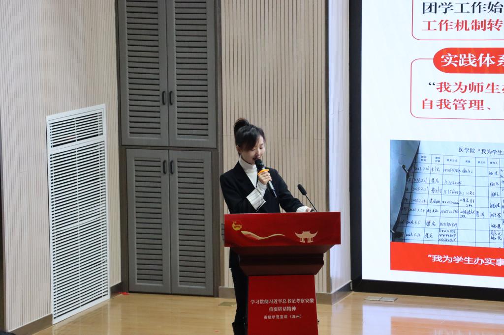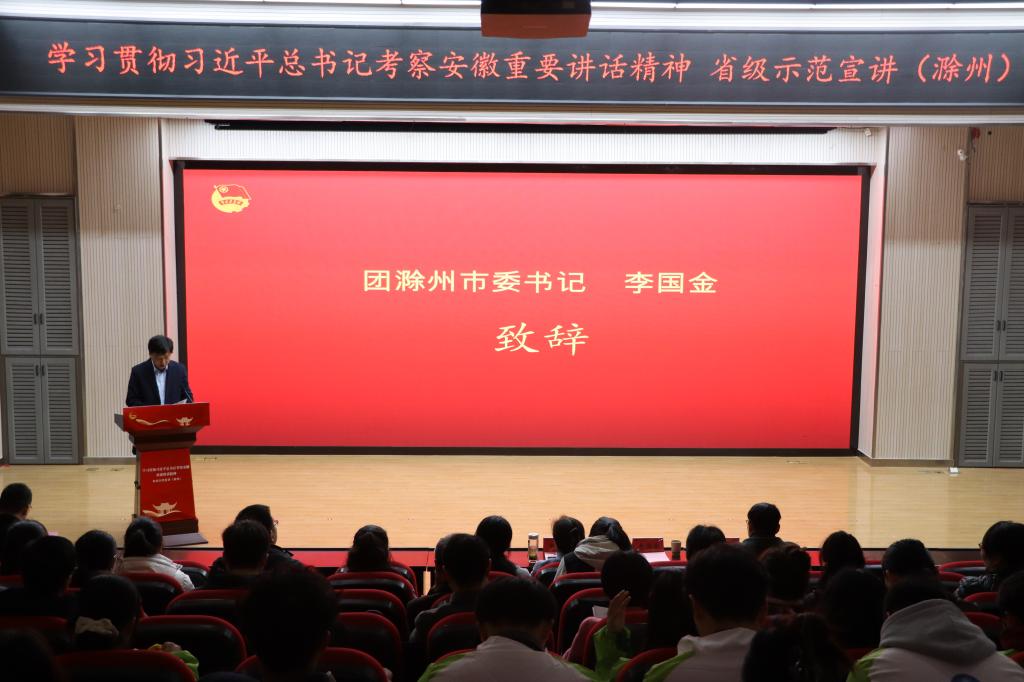 为深入学习贯彻习近平总书记考察安徽重要讲话精神,做好习近平总书记重要讲话精神的“青年化”阐释,以小切口讲故事的方式引导广大青年更好担负起新时代新使命,为建设现代化新滁州提供坚强思想保证、强大精神力量。11月27日上午,由共青团安徽省委员会、安徽省青年讲师团主办,共青团滁州市委员会、滁州市委讲师团、共青团久久久一区二区三区|亚洲精品一区二区三区不|久久av网|精品国产一区二区三区久久久久久|午夜精品av|久久久久久久久久久久久久av|日韩亚洲欧美综合委员会、滁州市青年讲师团承办的学习贯彻习近平总书记考察安徽重要讲话精神省级示范宣讲(滁州)在我校举行。团滁州市委书记李国金、滁州市委讲师团团长林卫东、我校党委副书记牛春雨出席活动,滁州市委讲师团、团滁州市委相关负责同志,滁州市各县(市、区)、经开区、中新苏滁团(工)委宣讲工作负责同志,以及滁州市青年讲师团部分成员、我校青年师生代表共200余人参与,活动由团滁州市委副书记万小宇主持。
