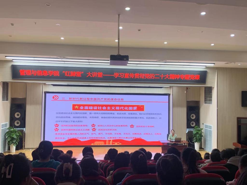 3月31日下午,管理与信息学院党总支副书记秦海娇在学院图文中心四楼报告厅以“学习宣传贯彻党的二十大精神,争做新时代好青年”为题,为学院2023年确定的211名入党积极分子上了一堂专题党课。