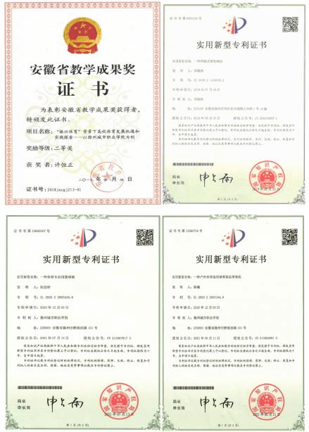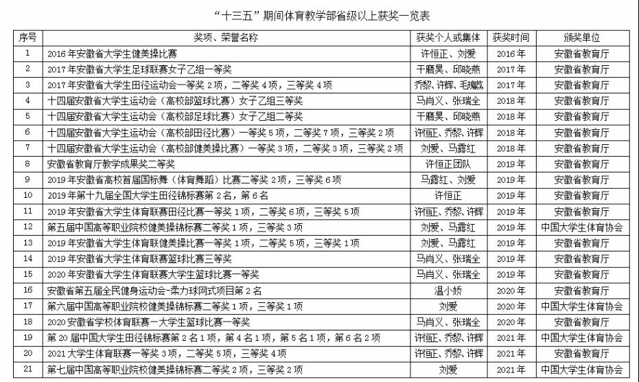 “十三五”期间,体育教学部教师在三类以上期刊发表论文40余篇,实用新型专利20余项,省级人文社科重点科研项目立项2项,省级自然科学重点项目立项1项,省级人才重点项目1项,主持省级质量工程项目5项,省职成教课题7项,省级教学成果二等奖1项。教师获评安徽省教坛新秀1名。