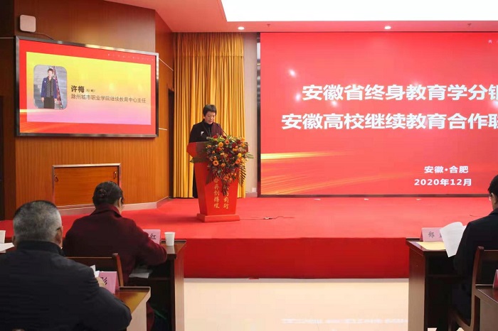 2020年12月,安徽省终身教育学分银行揭牌暨安徽高校继续教育合作联盟成立大会召开。党委委员、副校长施向阳出席会议并为学分银行和合作联盟揭牌,继续教育学院院长许梅应邀作为高职院校代表发言。