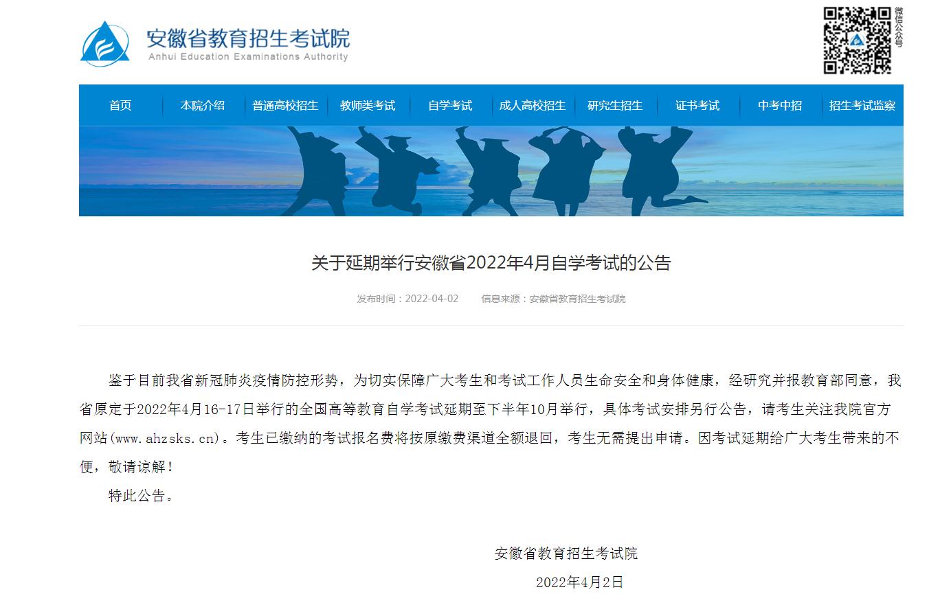 现将省教育招生考试院《关于延期举行安徽省2022年4月自学考试的公告》转发如下,原定于4月9日、10日举行的过程评价终结性考试顺延。请所有学员认真做好复习准备,请各专业负责人做好选定教师开展线上教学准备。