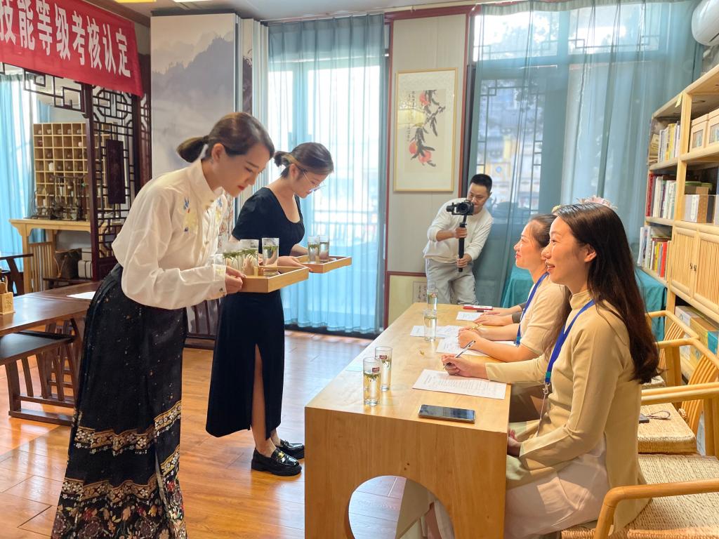 本次考核认定分理论知识考试和技能操作考核两部分。理论考试重点考察考生对茶文化知识、茶叶知识、茶艺礼仪、茶艺师职业道德规范等内容;实操部分分为茶样识别和常见茶类冲泡实操演示,由3人组成考评小组,按照茶艺师国家职业技能等级标准要求进行打分测评。考试过程中,我校严格落实考务工作规范和要求,精心组织,考场秩序井然。