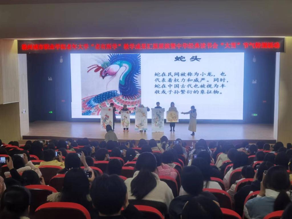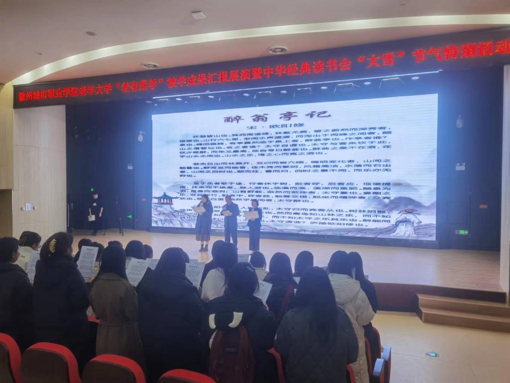 久久久一区二区三区|亚洲精品一区二区三区不|久久av网|精品国产一区二区三区久久久久久|午夜精品av|久久久久久久久久久久久久av|日韩亚洲欧美综合老年大学自成立近两年来,经过校领导及师生的共同努力,今年校老年大学获得“滁州市老年教育示范学校”的荣誉称号;《坚持“三贴近 三体现”开展老有所学行动》案例在全国高校现代远程教育组主办的评选活动中荣获优秀案例奖并入选“中国老年教育优秀案例库”;校老年大学丰乐社区教学点成功当选为“2023年乡镇(街道)老年学校省级示范校”。为充分展示我校老年大学学员风采,同时弘扬中华优秀传统文化,推进“书香校园”建设,培养青年学生的阅读习惯,在学校形成爱读书、读好书、想读书的浓厚氛围,12月7日下午,在我国传统的二十四节气—“大雪”节气来临之际,宣传统战部、继续教育学院、团委共同举办校老年大学“老有所学”教学成果汇报展演暨中华经典读书会“大雪”节气特别活动。校党委委员、校老年大学校长施向阳,校党委委员、宣传统战部部长陈通,校老年大学常务副校长、继续教育学院院长许梅,团委书记陈婷婷以及中华经典读书会近400名会员参加了活动。