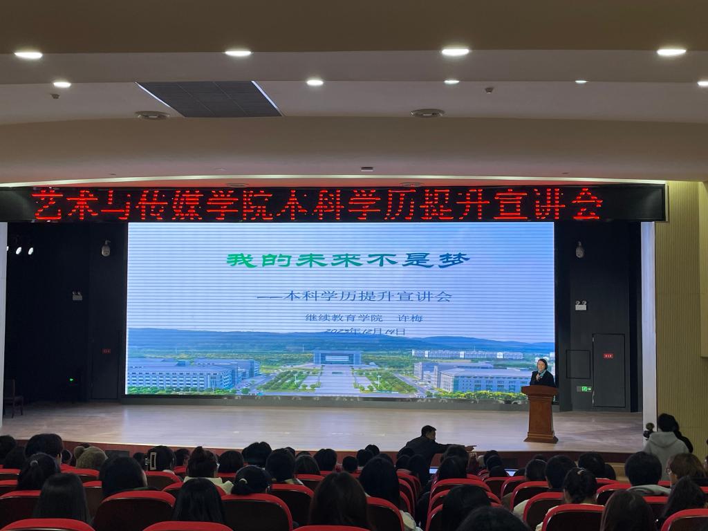为更好地服务我校学生提升学历,拓宽就业渠道,近日,继续教育学院组织开展两场本科学历提升宣讲会。宣讲由继续教育学院院长许梅主讲,艺术与传媒学院、管理与信息学院六百余名新生参加。
