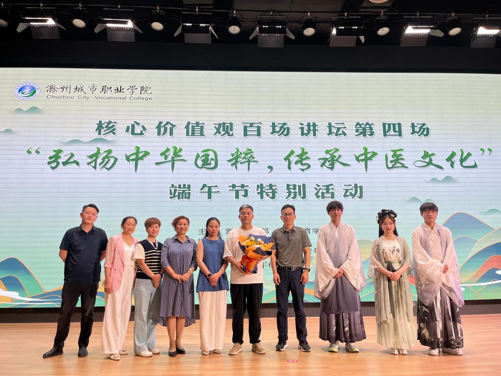 “一年一端午,一岁一安康”,为进一步弘扬社会主义核心价值观,用中华优秀传统文化中蕴涵的道德和智慧,提升当代大学生的精神境界,厚植文化自信,6月5日下午,在端午节即将来临之际,由校宣传统战部、继续教育学院主办,护理学院、医学院协办,中华经典读书会和校老年大学承办的核心价值观百场讲坛第四场“弘扬中华国粹,传承中医文化”端午节特别活动在管理与信息学院报告厅拉开帷幕,校党委副书记、校长汪上,校党委委员、副校长吴慧珍,医学院副院长徐旭,继续教育学院副院长孟红军,南京师范大学圆梦基金项目导师、六代中医世家传承人李志野,校老年大学学员、滁州心理学会及学生代表300多人参加活动。