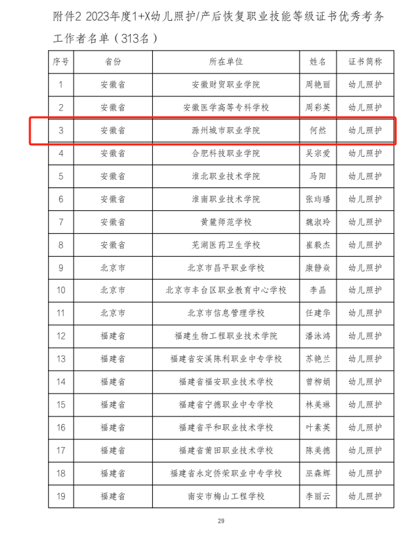 热烈庆祝我校荣获2023年度“1+X”幼儿照护职业技能等级证书示范考核站点荣誉称号,何然老师获2023年度“1+X”幼儿照护职业技能等级证书优秀考务工作者称号,曹艳老师组稿的案例荣获优秀案例。