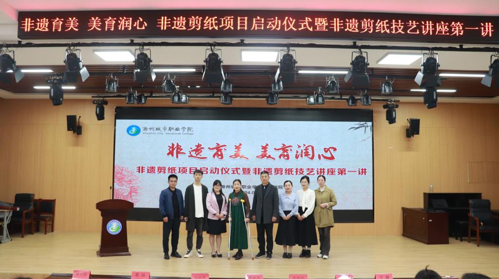 为弘扬中华优秀传统文化,感悟非物质文化遗产魅力,促进以美育人、以文化人,打造以“剪纸”为特色课程,具有厚重传统文化底蕴的“树人”品牌活动。4月18日下午,由校工会与教育学院联合主办的“非遗育美,美育润心”非遗剪纸项目启动仪式暨非遗剪纸技艺讲座第一讲在C2北1102报告厅隆重举行。活动特邀省级非遗剪纸传承人朱咏梅作专题讲座,校工会委员会主席钱庆兵,非遗凤画市级传承人、安徽滁州技师学院副教授陈海珍,教育学院副院长袁远,教育学院团总支书记黄正顺等出席活动。