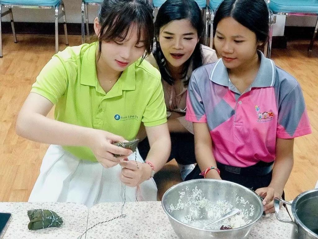 活动伊始,我院学生代表从历史起源、主要习俗、饮食文化、各地特色四个方面为在场的中外同学介绍了端午节的由来与传承。随后,在“中国传统美食制作小课堂”上,我院学生为泰国师、生代表详细介绍了粽子的制作方法,在“小老师”的指导下大家很快掌握了其中技巧,并纷纷尝试实践。泰国教师表示中国的粽子非常好吃,没想到简单的糯米放上蜜枣就会有如此好的口感。大家在包制粽子的过程中感受制作中国传统美食的乐趣,一个个包好的粽子也承载着一份份美好的祝福。