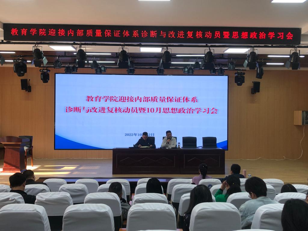 为做好诊改复核迎检工作,10月12日下午,教育学院在C2北报告厅召开了教育学院迎接内部质量保证体系诊断与改进复核动员会。教育学院党总支书记钱庆兵,校党委委员、教育学院院长高国柱,教育学院副院长徐立娟、刘明辉及全体教师参加会议,会议由徐立娟主持。