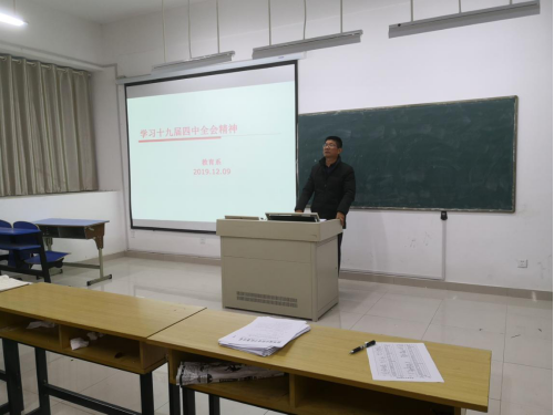钱庆兵书记带领全体教师学习了党的十九届四中全会精神,他强调作为新时代的高校教师,一定要提高政治站位,自觉将思想和行动统一到全会精神上来,始终秉持为党育人、为国育才的使命担当,立德树人;学习宣传贯彻党的十九届四中全会精神,是当前和今后一个时期的重要政治任务。广大教师要增强责任感,结合书本和实际向学生讲好全会精神,让全会精神在教育系师生心中落地生根。