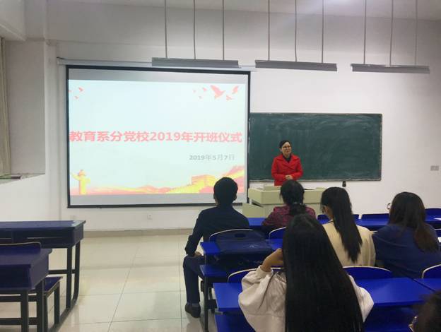 4月27日晚,教育系2019年度分党校开班仪式在C1南楼208教室举行。教育系党总支副书记陈之娟主持开班仪式。教育系党总支书记胡墨农,学生支部书记高国柱,团总支书记陈立超,教工支部、学生支部教师代表,学生入党积极分子、发展对象及预备党员约70人参加活动。