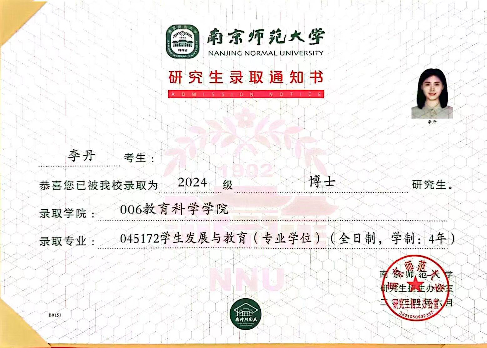 近日,我院李丹老师收到南京师范大学博士研究生录取通知书,将攻读南京师范大学学生发展与教育专业博士学位。