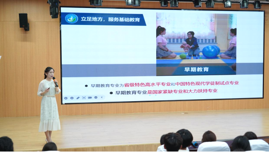 徐立娟以“走进早期教育专业”为题,向新同学介绍早期教育专业发展现状并解读人才培养方案。她希望每位同学都能认可早期教育专业的重要价值和专业性,为“准早教人”的身份而自豪。她结合生动鲜活的案例,通过早期教育专业同学的竞赛获奖、社会实践、升本就业等情况激励新生们点燃对教育事业的向往与热爱。
