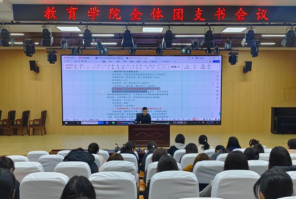 3月14日,教育学院在报告厅召开全体团支书会议,会议由团总支书记黄正顺主持,本次会议总结寒假返家乡社会实践与学雷锋活动开展情况,对读书月、五四红旗团支部评选等近期重点工作进行部署。
