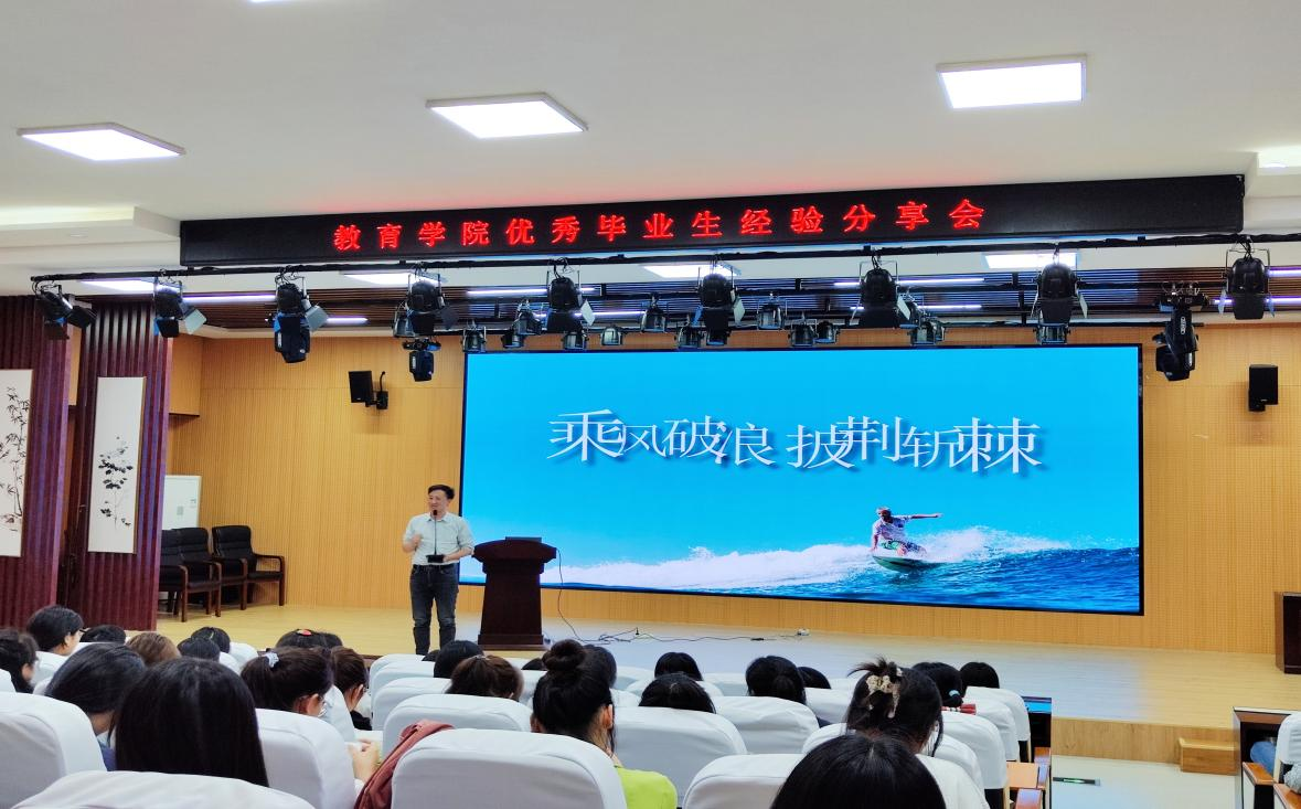 王德安,中共党员,2014级学前教育专业,在校期间曾任职教育学院学生会主席,曾创业谦达印象文化传媒公司,现就职于全椒米琪儿早教托育园,任职宣传主管。王学长首先分享了自己大学丰富的生活,从做音乐,创业当老板,当导演三个方面鼓励年轻人要有梦想,要为梦想付出脚踏实地行动。同时他也给我们的学生提出了几点建议:一是在校期间练好基本功,二是把该考的证都考到手,三是怀揣一份谦虚的态度,四是保持稳定的心态和钻研的精神。王学长的分享既精彩纷呈又诙谐幽默,多次被同学们热情的掌声打断。