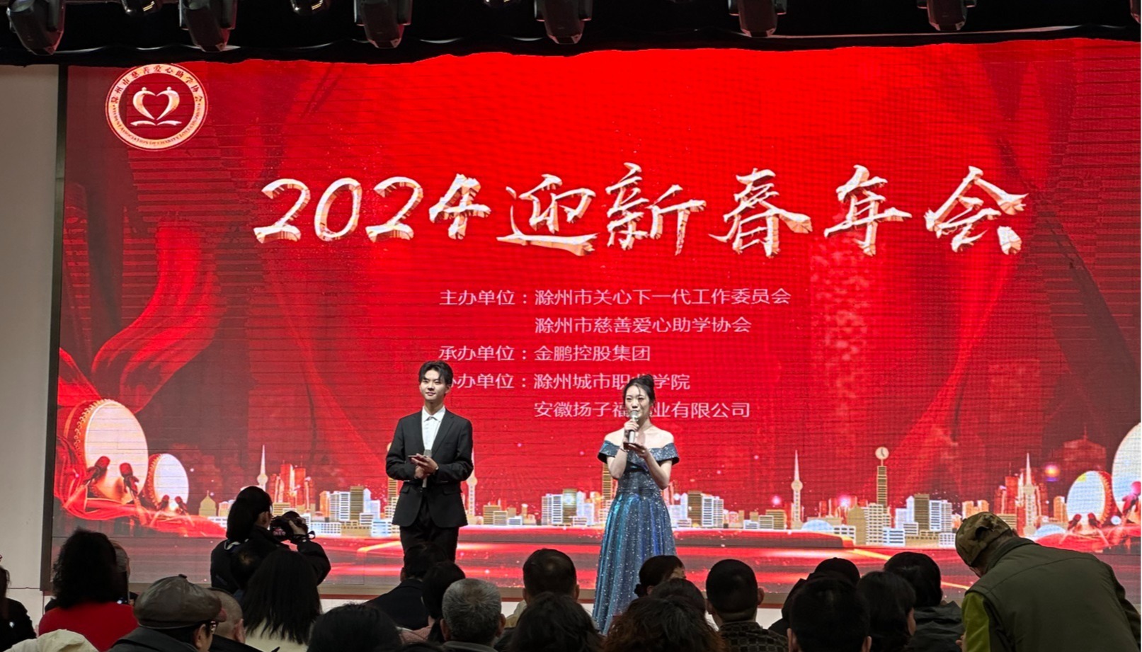 1月4日,滁州市慈善爱心助学协会2024迎新春年会在金鹏酒店召开,滁州市关心下一代工作委员会副主任朱庆龙,慈善爱心助学协会会长、金鹏控股集团董事长孙元武等出席活动并讲话,我院学子应邀参加义演并担任晚会主持。