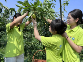 助梨小分队在梨园负责人的带领下进入梨园种植基地进行采摘,帮助果农完成采摘工作。据了解该种植基地采取“合作社+农户”模式来助推“梨经济”提质增效,其他应季水果为辅种植销售,成为农民增收的支柱产业。队员们穿梭在梨树林间,个个干劲十足,分工协作,梨园里劳动的身影熙熙攘攘,洋溢着青春的活力。
