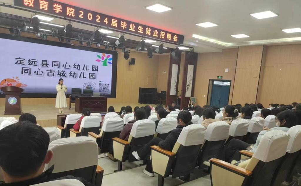 为切实做好2024届毕业生就业工作,搭建用人单位和毕业生双向选择的供需平台,1月7日下午,教育学院举办企业进校园系列招聘宣讲会,参与招聘的企业有定远同心幼儿园,定远同心古城幼儿园等4所幼儿园,120名学前专业毕业生参与此次招聘会。