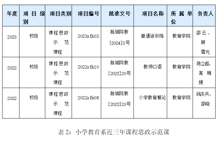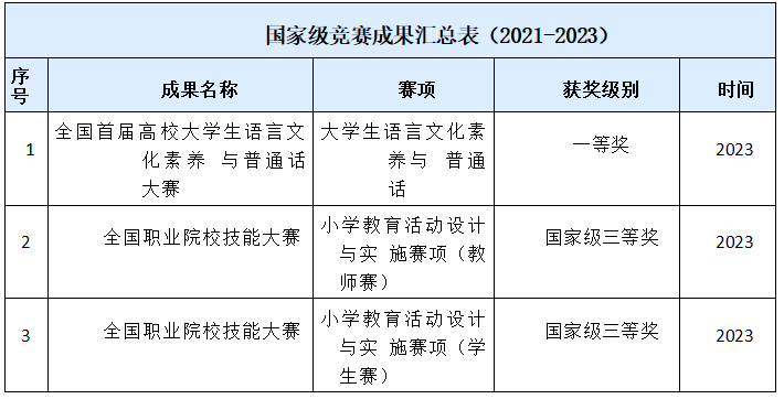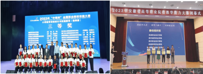 在学生培养方面,近三年来,指导学生获省级师范生技能大赛、省级职业技能大赛20多项,指导学生互联网+创新创业大赛、挑战杯创业计划等获得10多个奖项;学生参加省级教学能力大赛连续三年取得省级一等奖、二等奖、三等奖的好成绩,长三角教学能力大赛连续三年取得一等奖、二等奖、三等奖;尤其是2023年取得突破性进展;幼儿文学教师团队在全省职业院校技能大赛中获得一等奖的优异成绩;并且在2023年全国职业院校技能大赛(高职组)小学教育活动设计与实施赛项中分别获得教师赛和学生赛国赛三等奖和首届“‘吾爱吾师杯’全国高校大学生语言文化素养与普通话大赛”荣获一等奖的好成绩。小学教育专业培养人才出色,近年来教资通过率达93.5%,毕业生一次性就业率达94.3%,毕业生深受用人单位肯定,为安徽省特别是滁州及长三角地区培养了诸多优秀的小学教育工作者。