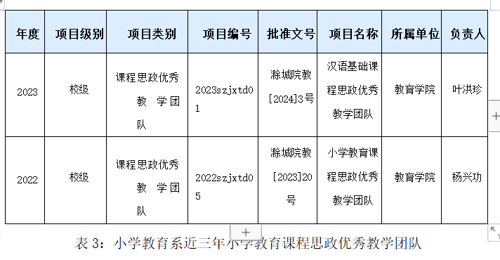 小学教育专业的专任教师严于教学,勤于教科研和教育教学能力提升,成果丰硕,承诺“培育未来教师,助力基础教育”。专任教师28名,其中高级职称11名,占比37%,双师型教师占比76%。专业中有省级教学团队和专业建设群,专业团队中拥有省级教学名师1人,省级优秀教师1人、省级教坛新秀2人。近五年已建成省级小学教育资源库,省级精品课程5门,获省部级以上教改项目3项;教师获省级教科研项目30余项;公开发表高质量论文54余篇;参编教材4本;横向课题2项,获省教学成果三等奖1项;近两年取得了专利的零突破,教师获专利3项。