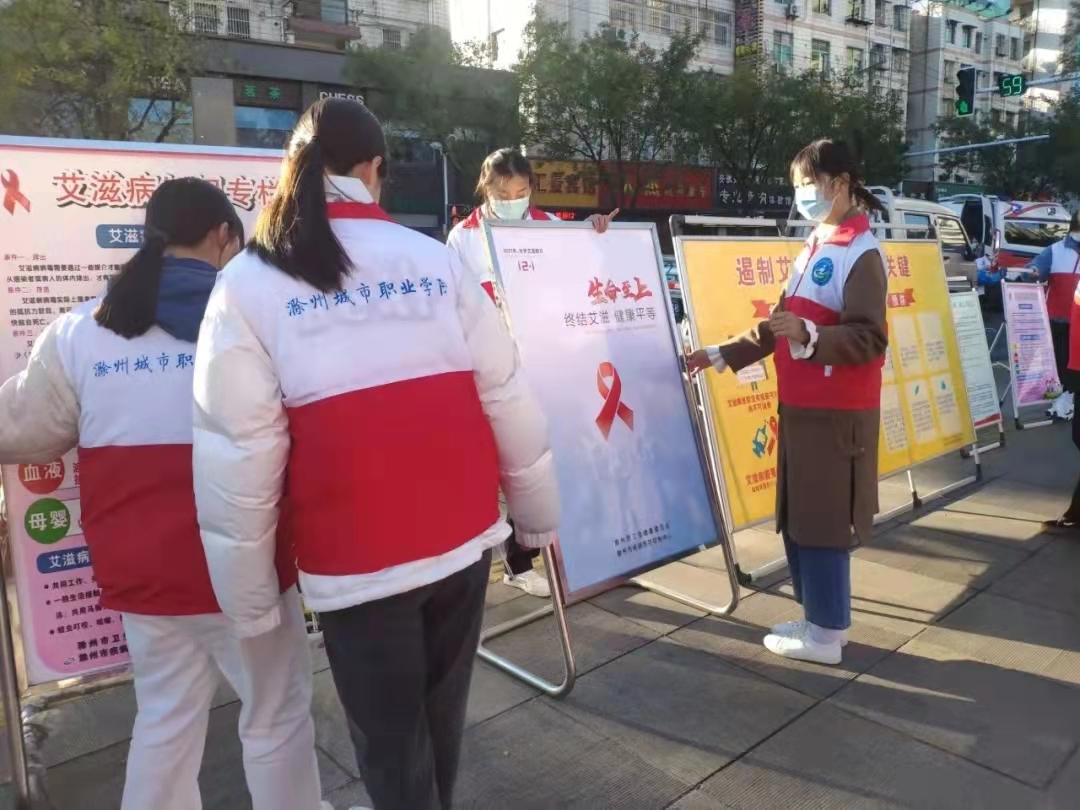 12月1日上午,由滁州市卫健委主办,市疾控中心承办的防治艾滋病主题宣传活动在市人民广场隆重举行。作为协办单位之一,我院“半根草”志愿者服务队20名青年志愿者参与到活动中,并面向广大市民发放了宣传资料,深入宣传性病、艾滋病、疫情防控以及健康营养膳食等相关知识,给群众送去了冬日的温暖及防病保健技能,进一步减少了传染性疾病及慢性病的发生,耐心周到的服务赢得了广泛好评,滁州电视台、滁州日报等多家媒体进行了采访宣传报道。