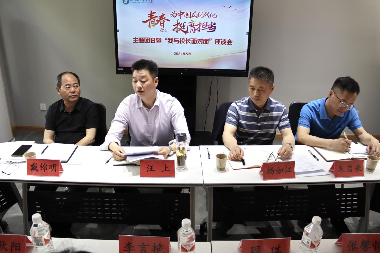 5月15日下午,学校在大学生活动中心“青年之家”举行“青春为中国式现代化挺膺担当”主题团日暨“我与校长面对面”座谈会。党委副书记、校长汪上出席座谈会并讲话,党委委员、学生处处长杨如江,教务处处长戴锦明,招生就业处处长朱启来,办公室副主任王轶以及各二级学院团总支书记和学生代表参加座谈。会议由校团委书记陈婷婷主持。
