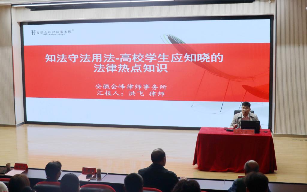 为进一步增强我校学生的法律意识和法治观念,加强法治安全教育,10月17日下午,学校联合滁州市政协关工委开展了普法知识讲座。校党委副书记牛春雨,市政协关工委主任胡新忠,市政协关工委副主任李锡富、刘萍、张先礼,校关工委副主任汪勇出席活动。活动邀请滁州市法律界优秀青年律师、安徽会峰律师事务所合伙人洪飞进行主讲,活动由校团委书记陈婷婷主持,来自各学院200余名青年大学生聆听讲座。