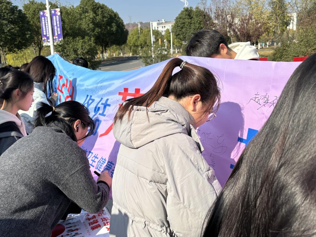 12月1日,在校食堂前广场开展了“艾”在行动、“艾”的抱抱、防“艾”同行活动。活动现场师生积极参与,现场制作红丝带,写下对艾滋病患者的祝福寄语,并通过拥抱玩偶、参与飞行棋游戏等方式,传递温暖与理解的力量,表达对艾滋病患者的关心与支持。
