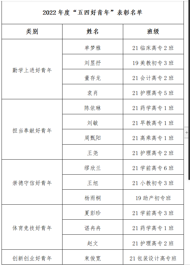 为深入学习宣传党的二十大精神,贯彻习近平总书记关于青年工作的重要思想,大力推进青年思想道德建设,积极培育和践行社会主义核心价值观,校团委经过审核决定:拟评选单梦雅等15名同学“五四好青年”荣誉,现将拟评选结果公示如下: