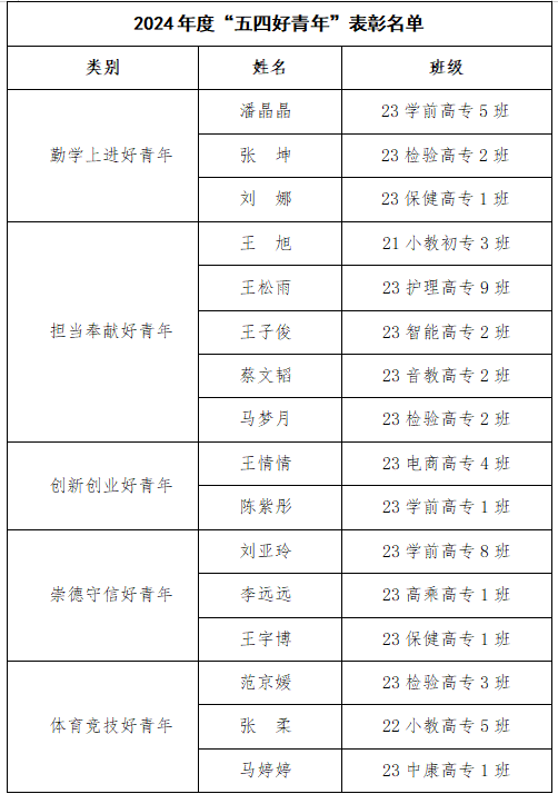 为深入学习贯彻习近平总书记关于青年工作的重要思想,大力推进青年思想道德建设,积极培育和践行社会主义核心价值观,校团委决定:拟评选潘晶晶等16名同学“五四好青年”荣誉,曹盛鑫等15名同学“最美志愿者”荣誉,巩东旭同学“我身边的雷锋”荣誉。现将拟评选结果公示如下:
