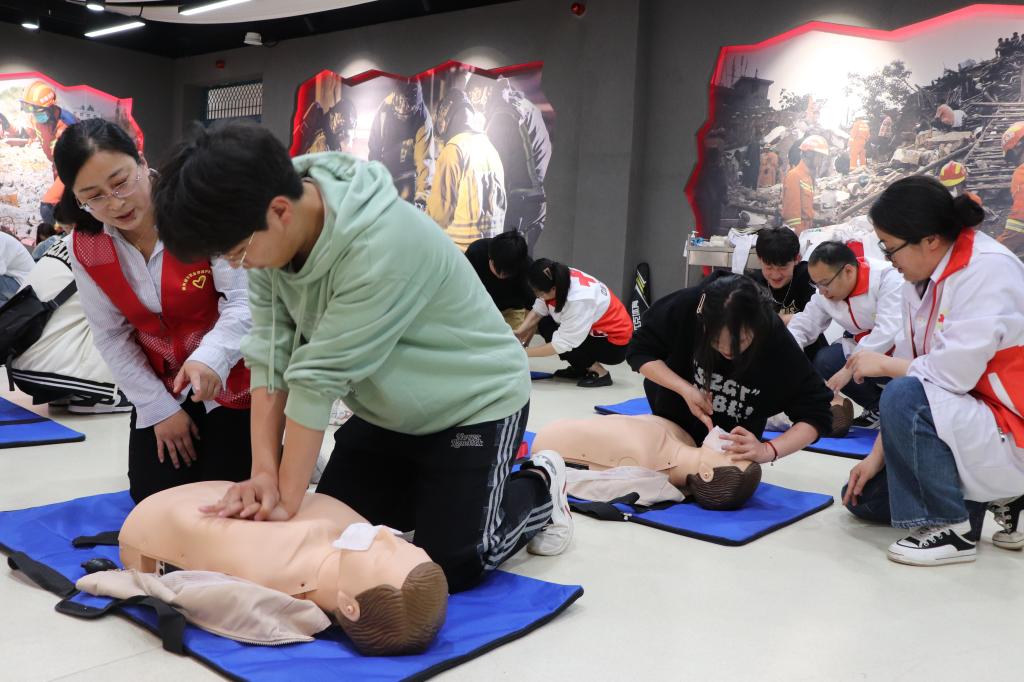 理论学习结束后,10位专业老师分别利用模型讲解并示范了心肺复苏的操作步骤与要点。现场师生参与互动积极体验心肺复苏操作,大家反复练习、不断纠正各环节的姿势、手法,确保动作标准、力度到位。