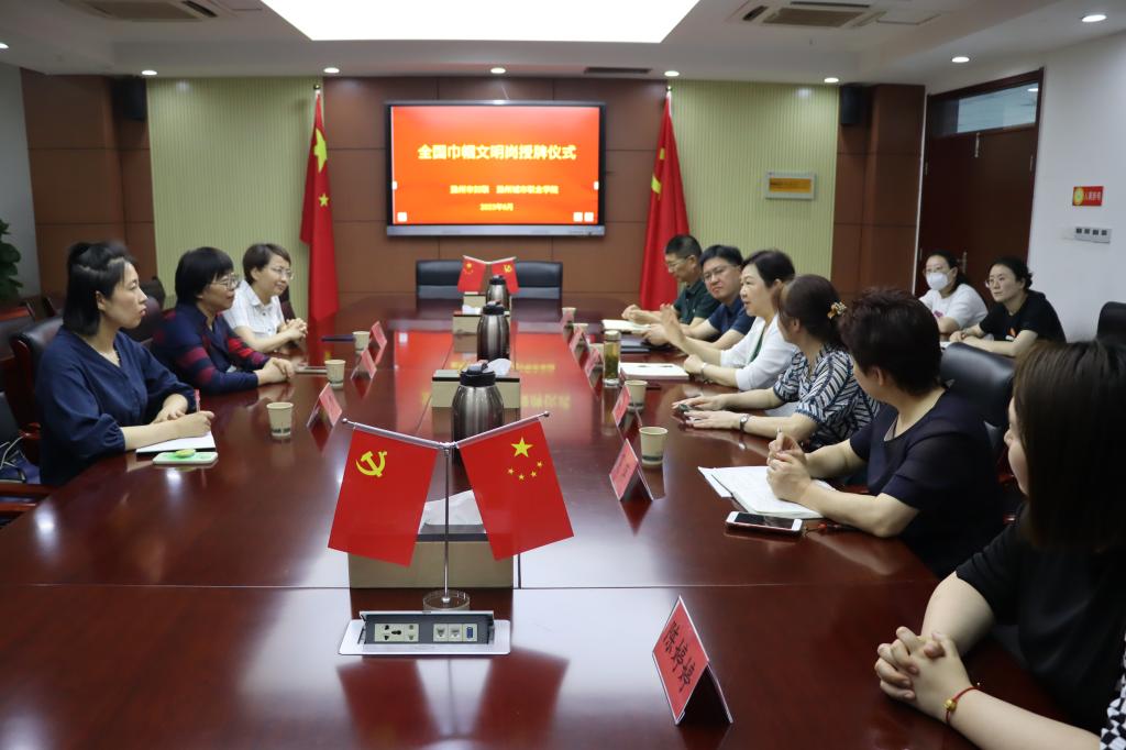 6月14日上午,滁州市妇联党组书记、主席周爱勤,滁州市妇联党组成员、副主席吴晓丽以及滁州市妇联发展部王静一行深入我校,向荣获“全国巾帼文明岗”称号的我校团委授牌。仪式在图文中心第四会议室举行,党委书记张志华出席仪式并讲话,党委委员、副校长吴惠珍,党委委员、办公室主任、宣传统战部部长陈通,工会主席钱庆兵、财务处处长吴萍,团委书记陈婷婷及部门全体成员参加了授牌仪式。