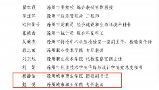 为深入学习贯彻习近平新时代中国特色社会主义思想,认真贯彻落实习近平总书记对技能人才工作的系列重要指示精神,把习近平总书记关于青年工作的重要思想体现到广大职业青年服务之中,激励广大青年立足岗位,奋发有为、踏实工作。共青团滁州市委下发了《关于命名2022年度“滁州市青年岗位能手”的决定》,我校杨静怡、赵悦两位教师荣获2022年度“滁州市青年岗位能手“称号。
