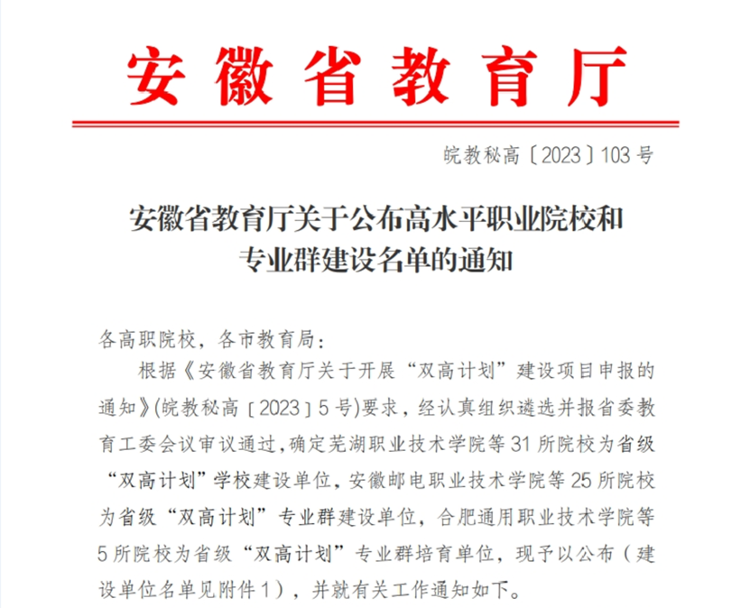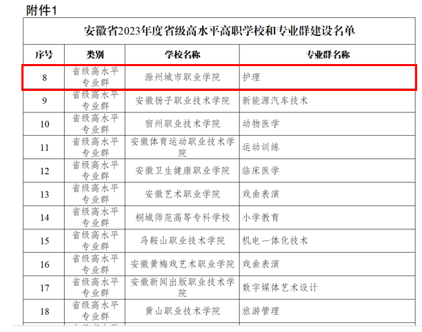 近日,安徽省教育厅发布了《安徽省教育厅关于公布高水平职业院校和专业群建设名单的通知》(皖教秘高〔2023〕103号),我校护理专业群获批2023年度安徽省高水平专业群建设项目。祝贺!