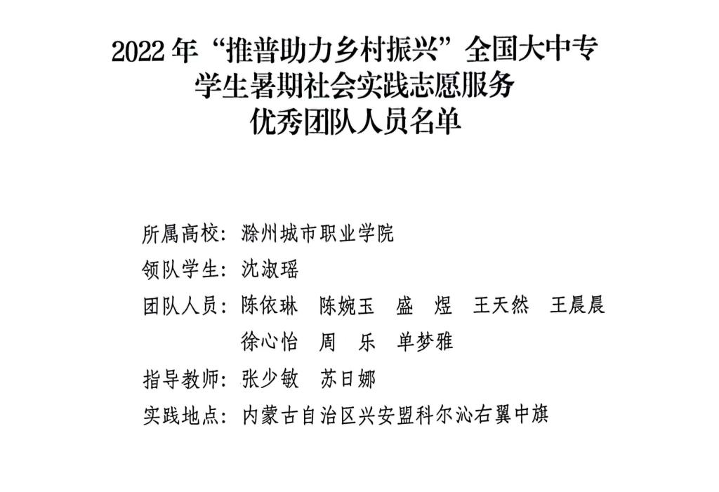 近日,教育部语言文字应用管理司、共青团中央青年发展部向我校寄来表扬信,表扬我校参与2022年“推普助力乡村振兴”全国大学生社会实践志愿服务活动的师生,由医学院张少敏、苏日娜老师指导,陈依琳、陈婉玉、盛煜、王天然、王晨晨、徐心怡、周乐、单梦雅、沈淑瑶等同学组成的推普助力乡村振兴实践队被评为优秀团队。热烈祝贺!