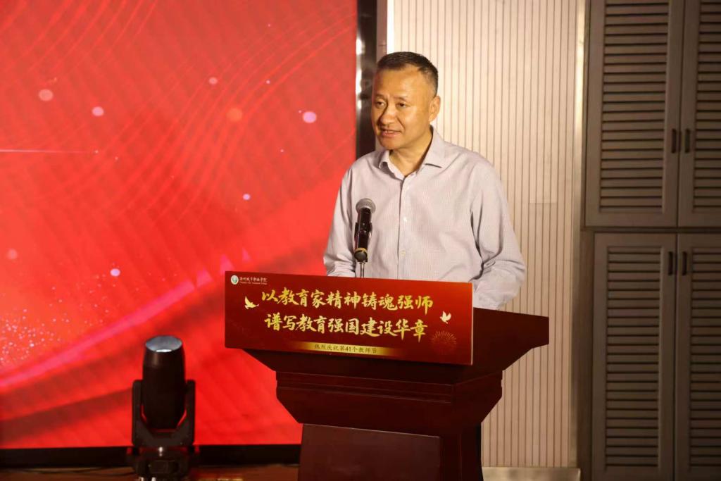 校党委书记王燕永首先向长期以来奋战在教学、管理、服务一线的全体教职工致以节日的问候和崇高的敬意。他指出,过去一年,学校在校园建设、产教融合等方面成效显著,离不开全体教职工的辛勤付出和无私奉献。他对全体教职工提出四点希望:一是坚定理想信念,做有情怀的教育者;二是涵养高尚师德,做有品德的教育者;三是提升育人能力,做有智慧的教育者;四是乐教爱生,做有温度的教育者。王燕永号召全体师生以教育家精神为引领,为建设教育强国及学校“双高”建设贡献力量。
