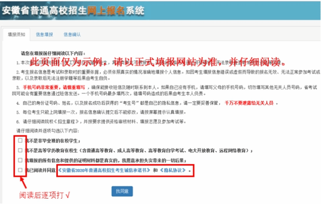 (1)请仔细阅读须知,点击并阅读《安徽省2021年普通高等学校招生考生诚信承诺书》和《隐私协议》,确定本人符合报名条件后,依次确认并勾选承诺内容。