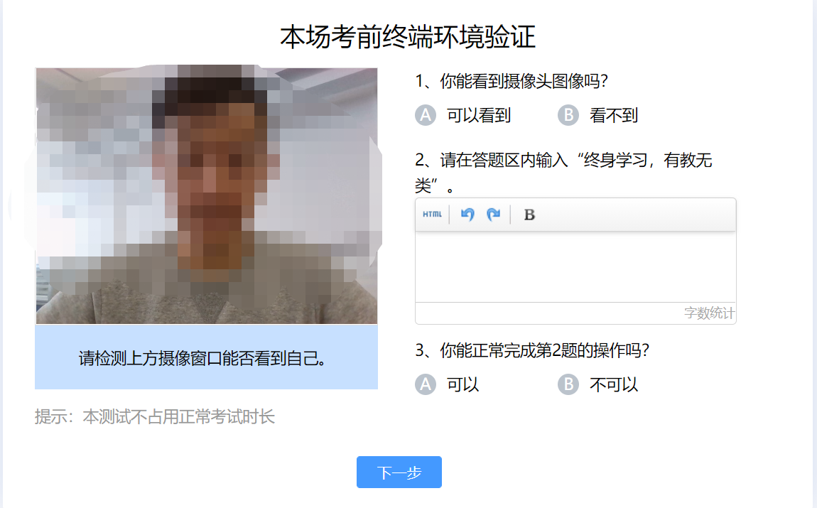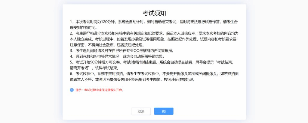 3. 考生在考试全程中应保持考试监控可以正常进行,不得遮挡摄像头,违者系统直接取消考试成绩。