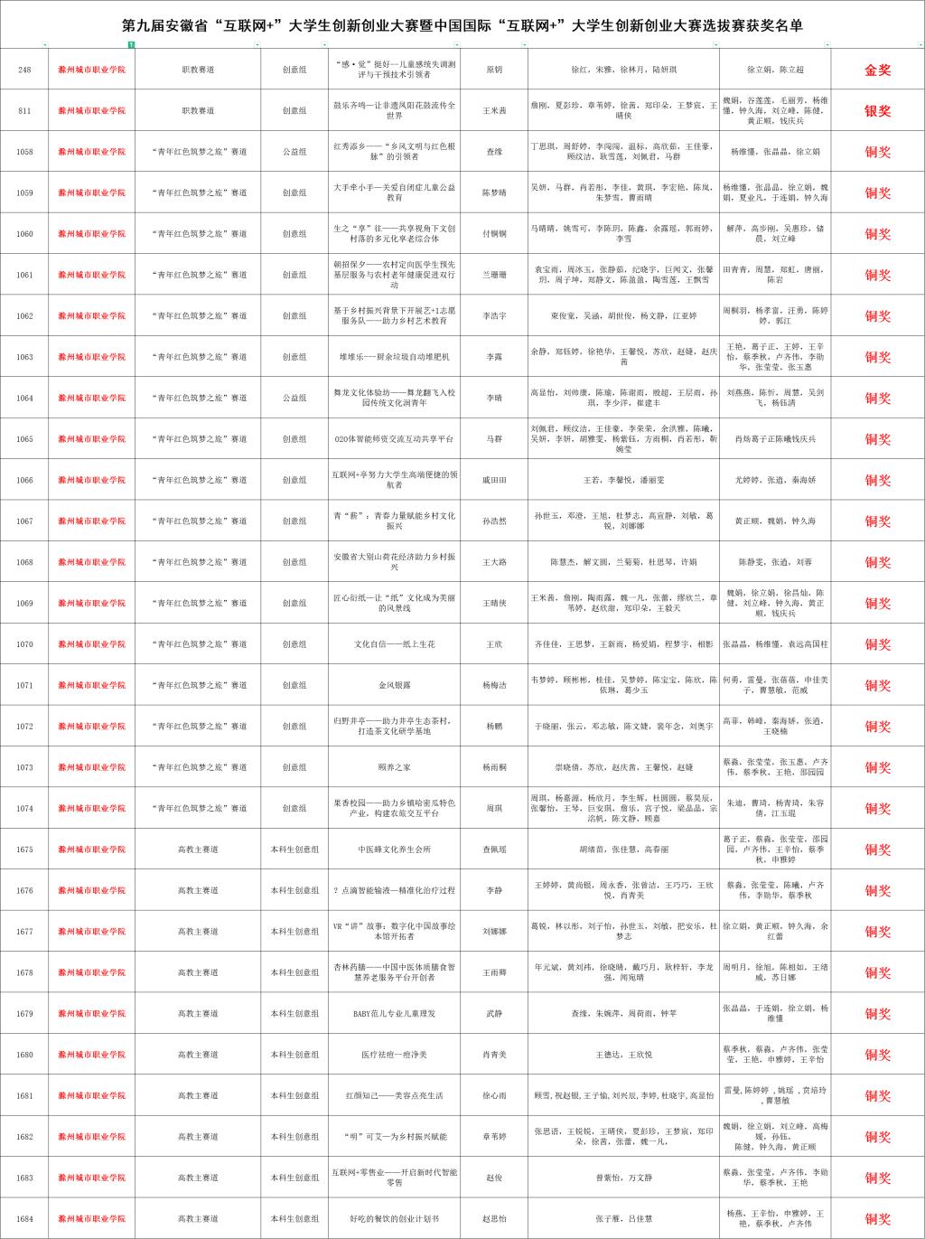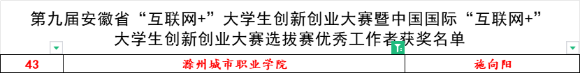 近日,第九届安徽省“互联网+”大学生创新创业大赛暨中国国际“互联网+”大学生创新创业大赛安徽省选拔赛结果正式公布。我校师生团队在高教主赛道、“青年红色筑梦之旅”赛道、职教赛道中共获得金奖1项、银奖1项、铜奖38项,其中,1个项目晋级国赛,取得了参加该项赛事以来的最好成绩,实现了获奖数量和质量的双突破。校党委委员施向阳被评为大赛“优秀工作者”,教育学院院长徐立娟被评为大赛“优秀指导老师”。